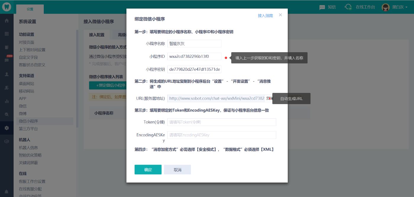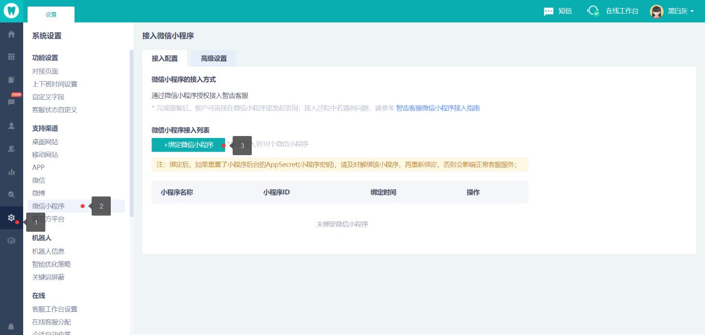 管理员登录智齿客服平台,打开【设置-支持渠道-小程序-绑定微信小程序】,如下图: