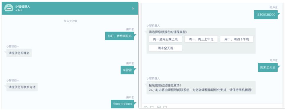 如用户提问 “我要报名” ,机器人会主动发问 “您的姓名” 、“联系电话”及“报名课程类型”,用户说依次回答后,在当前的交互页面完成了报名。